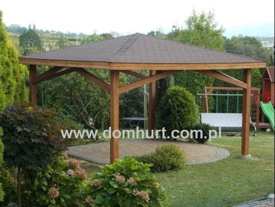 Altana ogrodowa 4-kąta na 4 słupach podporowych. Dach kryty gontem bitumicznym. Firma wykonuje także altanki pod zamówienie w oparciu o indywidualne projekty Klienta.