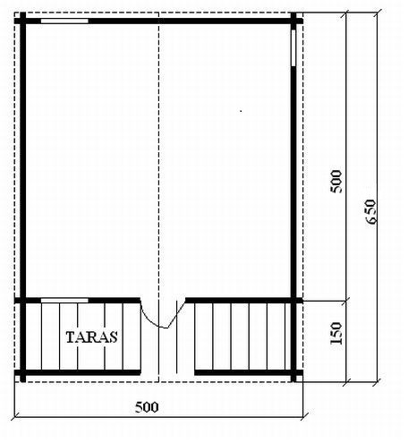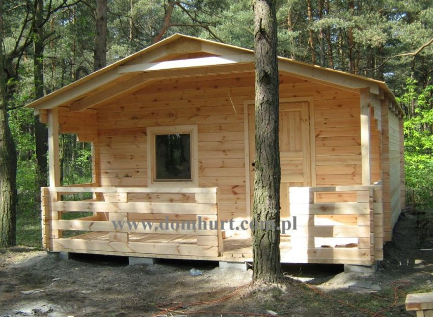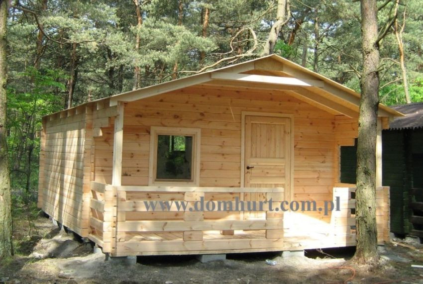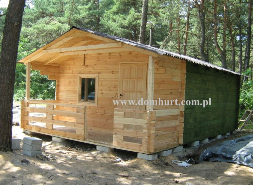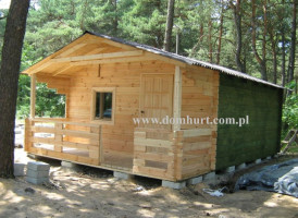 Parterowy domek rekreacyjny o wymiarach 500 x 650 cm wykonany z litej belki gr. 4 cm w systemie blokowo-wieńcowym lub w systemie szkieletowym z deski. W standardzie posiada przestronny zadaszony taras, wykończenie sufitu w boazerii (wewnątrz domku), dach kryty blachą, 1 komplet bloczków betonowych, izolację bloczków betonowych, impregnację przeciwogniową i przeciwgrzybiczną. Konstrukcja domu umożliwia dowolną zmianę powierzchni użytkowej. Domek nie wymaga fundamentu. Schemat budynku można zobaczyć w dodatkowych fotografiach. Cena podstawowa nie uwzględnia schodków widocznych na zdjęciu. Można je zamówić za dodatkową opłatą. Istnieje możliwość dowolnej zmiany powierzchni domu. Pow. całk. 30,24 m2