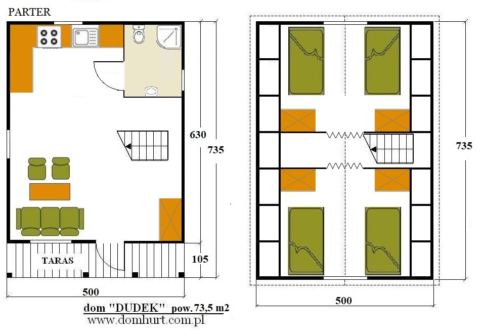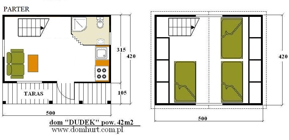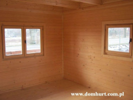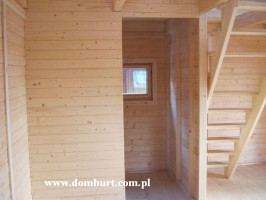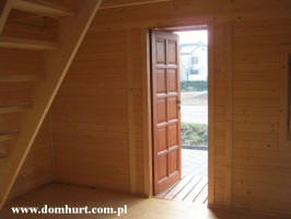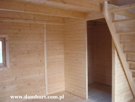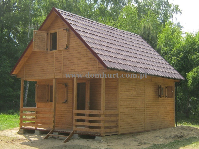 Przestronny dom letniskowy wykonany systemem szkieletowym. Proponowany o powierzchni od 42 m2 do 73,5 m2. Kąt nachylenia dachu 42o. Szerokość domu: 500 cm. Długość to wielokrotność odcinka 105 cm. Na parterze z powodzeniem można wydzielić łazienkę, kuchnię i salon. Poddasze do zagospodarowania. Istnieje możliwość rozbudowy tarasu, wykonania balkonu lub wprowadzenia innych zmian adaptacyjnych. Dom stawiany jest na bloczkach betonowych - nie wymaga fundamentu. Rozrys domu w dodatkowych fotografiach. Cena nie obejmuje wydzieleń wewnętrznych, okiennic oraz komina widocznych na zdjęciach i rzutach domu. Wysokość do szczytu: 499 cm