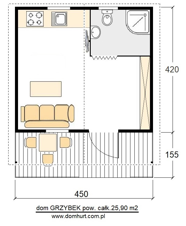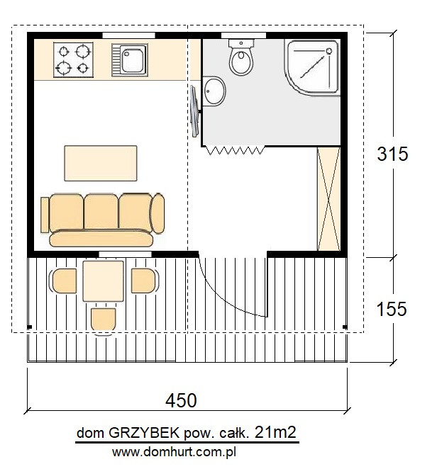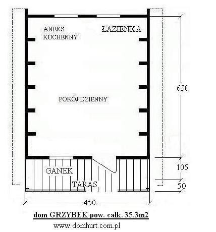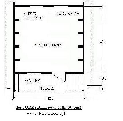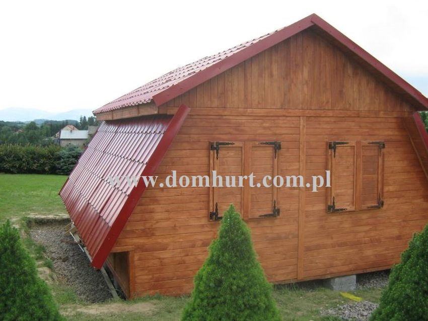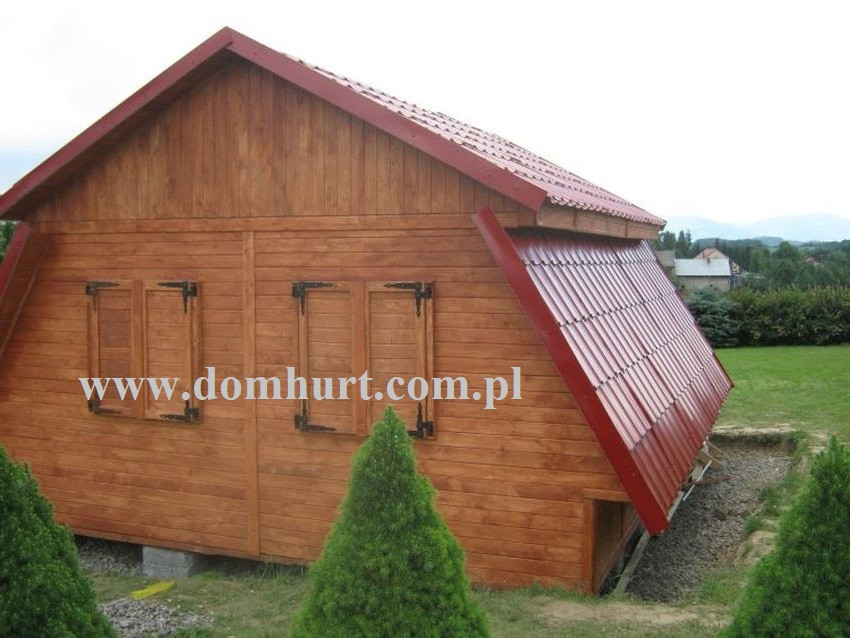 Parterowy domek rekreacyjno-letniskowy wykonany systemem szkieletowym. Oferowany jako domek kompletnie ocieplony wełną mineralną 5 cm lub jako domek nieocieplony. Zastosowane w domku boczne ściany proste na wysokość 120 cm dają duże możliwości adaptacyjne i aranżacyjne. Domek oferowany jest o powierzchni od 21 m2 do 35 m2. Stała szerokość: 450 cm, długość to wielokrotność segmentu: 105 cm. Domek nie wymaga fundamentu. Schemat budynku można zobaczyć w dodatkowych fotografiach. Cena podstawowa nie uwzględnia okiennic widocznych na zdjęciach. Możne je zamówić za dodatkową opłatą. Cena nie obejmuje okiennic i wydzieleń wewnętrznych widocznych na zdjęciach i rzutach domu.