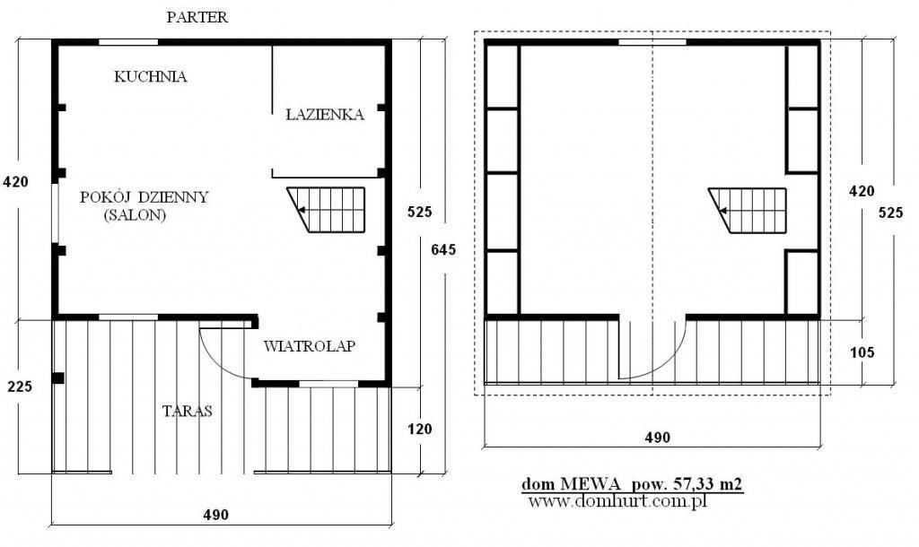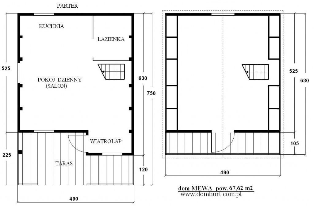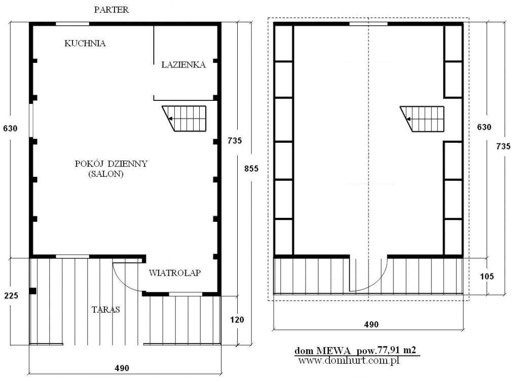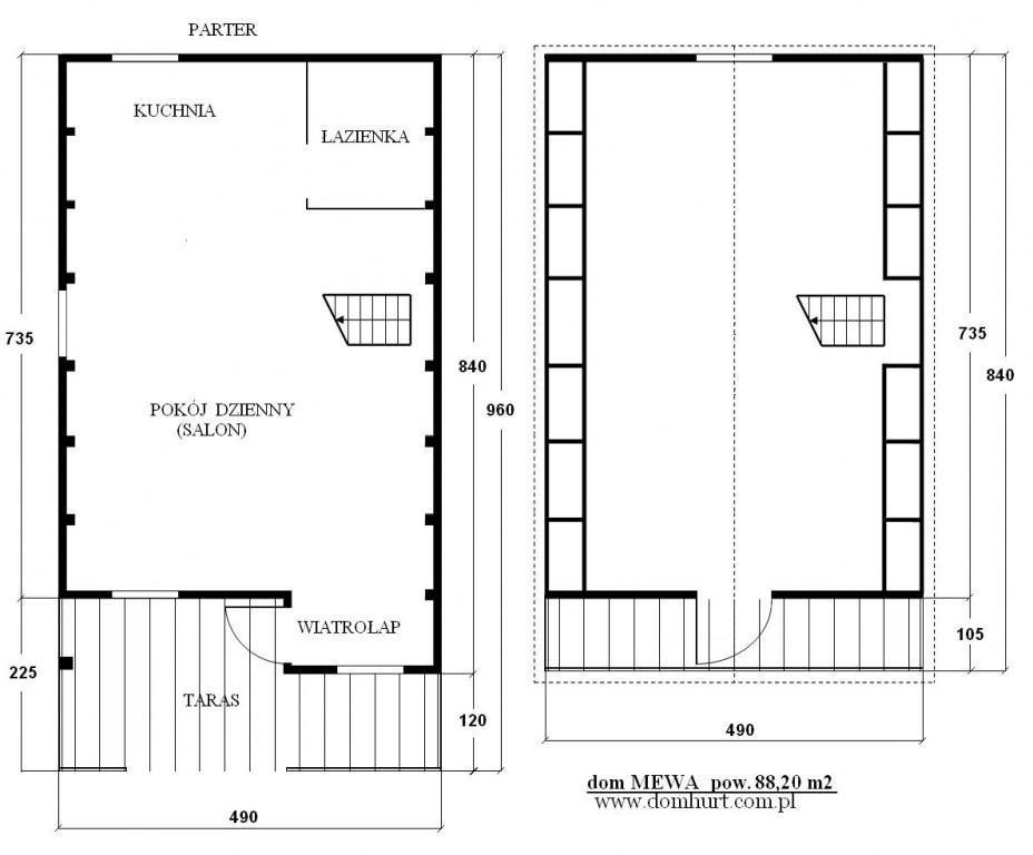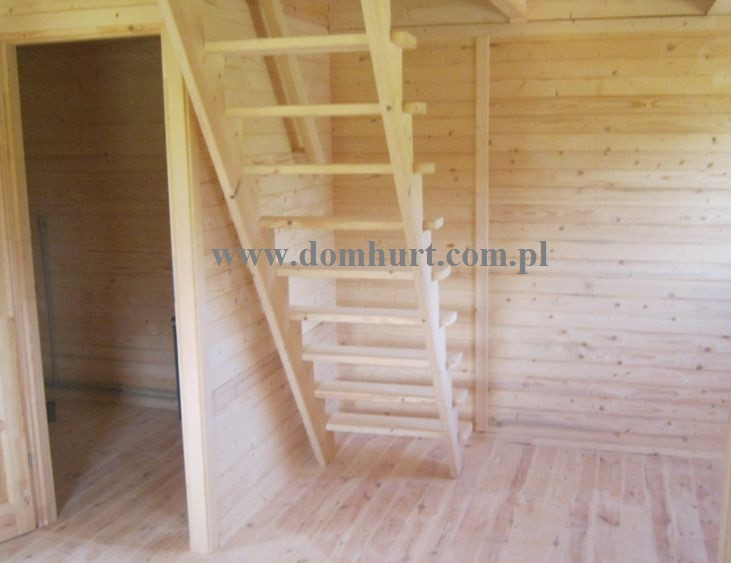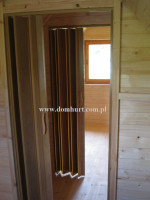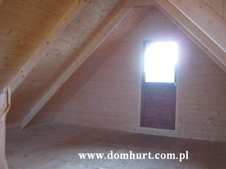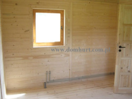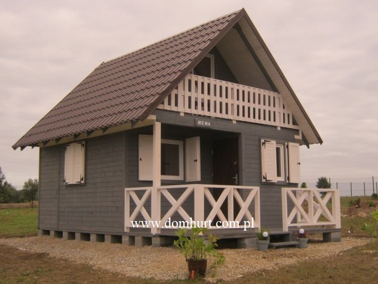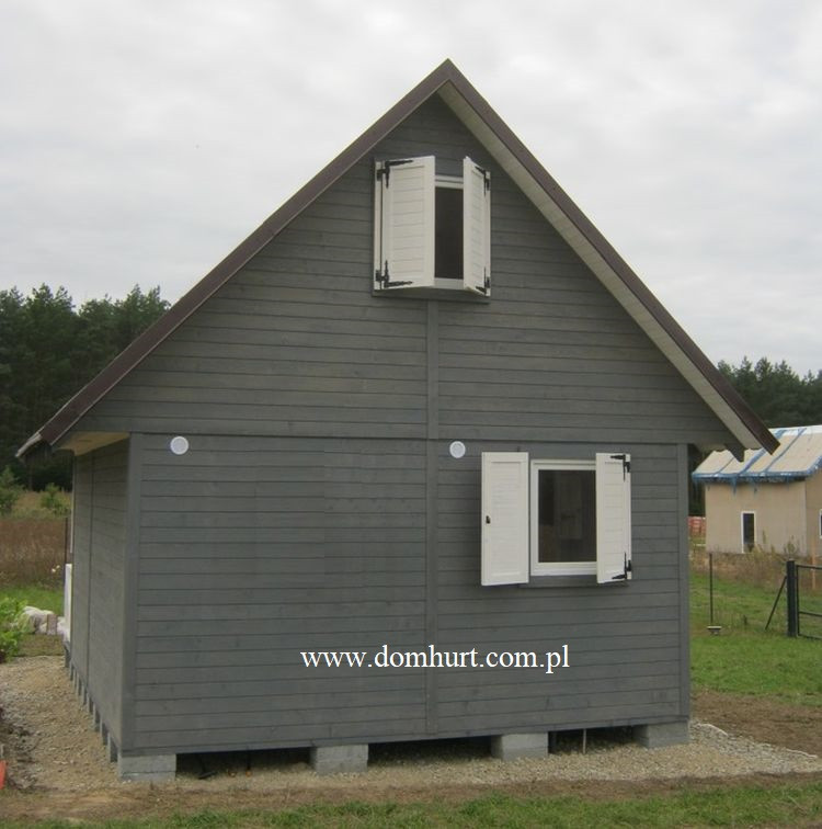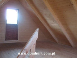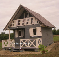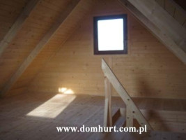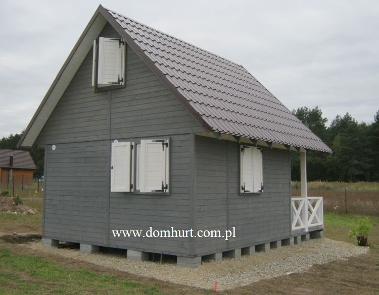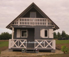 Dom letniskowy wykonywany systemem szkieletowym w DomHurt jako producent domów letniskowych. Szerokość domu: 490 cm. Kąt dachu: 45 stopni. W standardzie posiada niezadaszony taras, zadaszony ganek i balkon, na parterze ściany proste na wysokość 220 cm. Proponowany jest o powierzchni całk. od 47 m2 do 88 m2. Oferowany jako dom nieocieplony lub jako dom kompletnie ocieplony wełną mineralną 5 cm. Istnieje możliwość dowolnego wydłużania i skracania domu, rozbudowy tarasu oraz wprowadzania innych zmian adaptacyjnych. Dom stawiany na bloczkach betonowych -nie wymaga fundamentu. Schemat budynku można zobaczyć w dodatkowych fotografiach. Cena nie obejmuje okiennic oraz wydzieleń wewnętrznych widocznych na zdjęciach i rzutach domu. Wysokość do szczytu: 488 cm