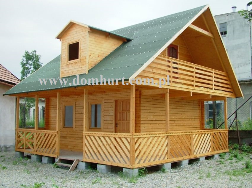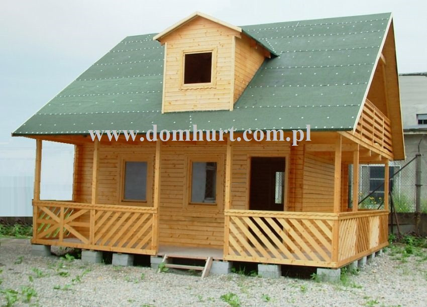 Dom letniskowy wykonywany w konstrukcji blokowo-wieńcowej z belki o grubości 10 cm lub w systemie szkieletowym. W standardzie oferowany z przestronnym zadaszonym tarasem oraz balkonem na poddaszu. W domu można z powodzeniem wydzielić kuchnię, łazienkę pokoju dzienny, wiatrołap. Poddasze otwarte do zagospodarowania. Dach kryty papą podkładową z możliwością zastosowania innego pokrycia dachowego. Istnieje możliwość wprowadzania dowolnych zmian adaptacyjnych: dobudowy wiaty, garażu, ganeczka... Dom proponowany w różnych rozwiązaniach powierzchniowych od 55,68 m2 oraz według indywidualnych koncepcji Klienta. Kąt dachu 45o. Schemat budynku można zobaczyć w dodatkowych fotografiach. Cena nie obejmuje wydzieleń wewnętrznych widocznych na zdjęciach i rzutach domu.