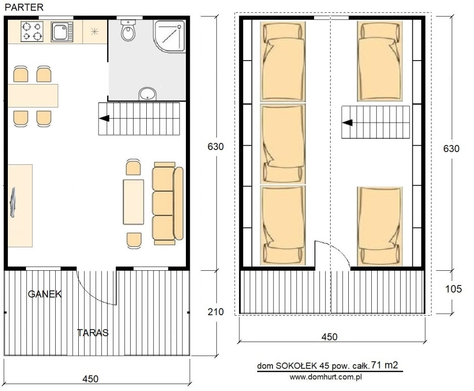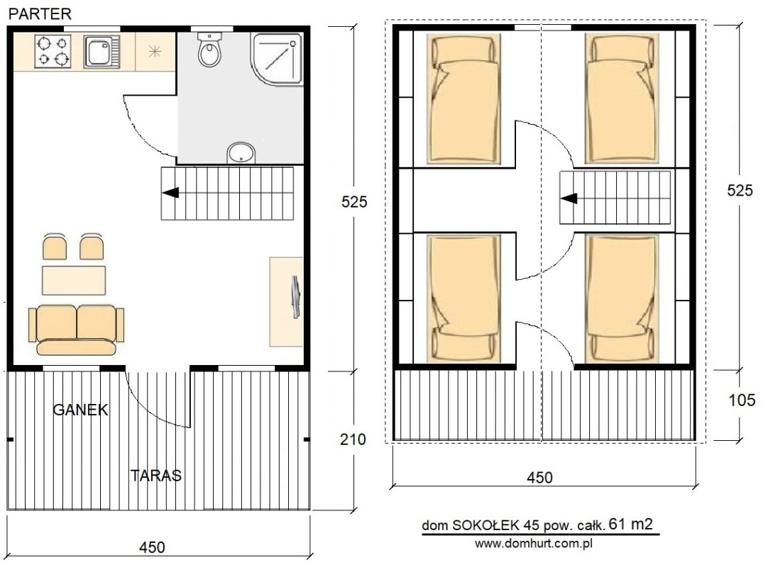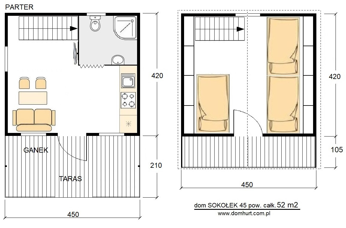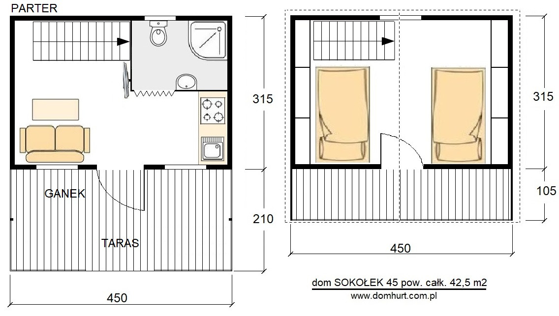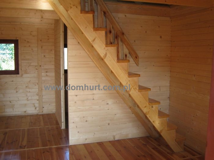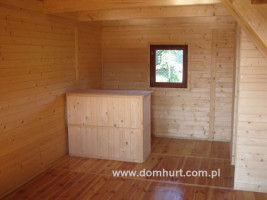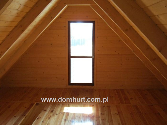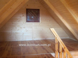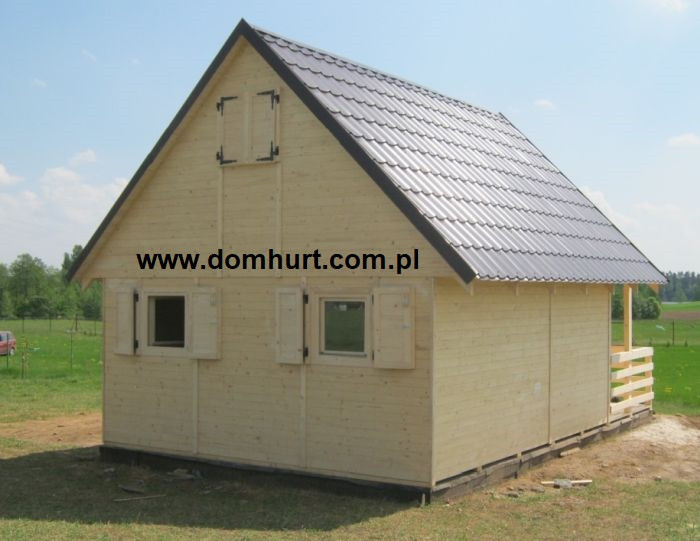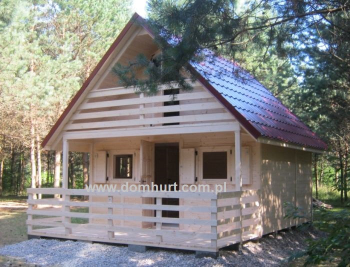 Dom letniskowy z poddaszem wykonywany systemem szkieletowym Domhurt jako producent domów letniskowych. Szerokość domu: 450cm. Kąt dachu: 45º. W standardzie posiada niezadaszony taras, zadaszony ganek i balkon, na parterze ściany proste na wysokość 220 cm. Proponowany jest o powierzchni od 42 m2 do 80 m2. Oferowany jako dom nieocieplony lub jako dom kompletnie ocieplony wełną mineralną 5 cm. Istnieje możliwość dowolnego wydłużania i skracania domku, rozbudowy tarasu oraz wprowadzania innych zmian adaptacyjnych. Dom stawiany jest na bloczkach betonowych -nie wymaga fundamentu. Schemat budynku można zobaczyć w dodatkowych fotografiach. Cena standardowa nie uwzględnia okiennic, lady kuchennej oraz wydzieleń wewnętrznych (widocznych na zdjęciach i rzutach domu). Można je zamówić za dodatkową opłatą.