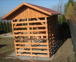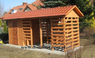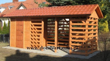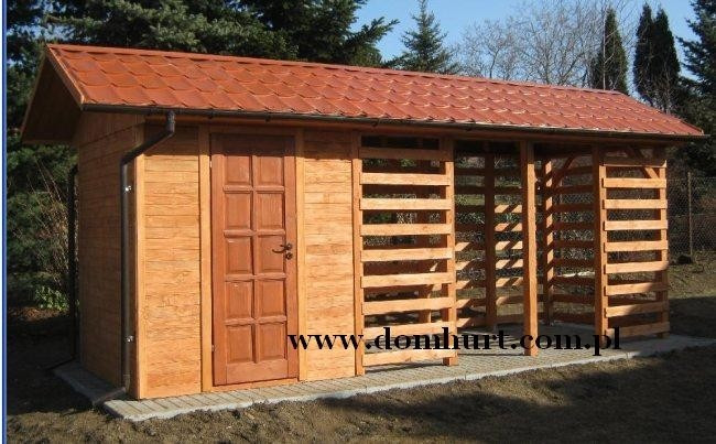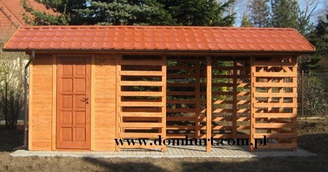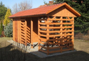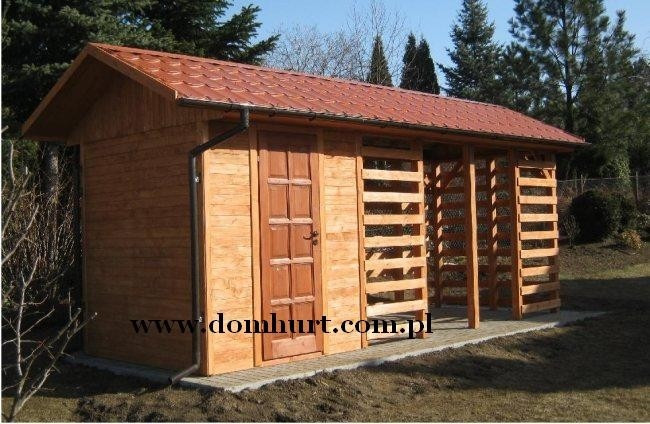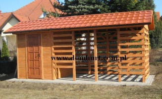 Domek narzędziowy z drewutnią wykonany systemem szkieletowym. Dach 2-spadowy kryty papą podkłądową. Wymiar domku i drewutni uzgadniane z kupującym.
